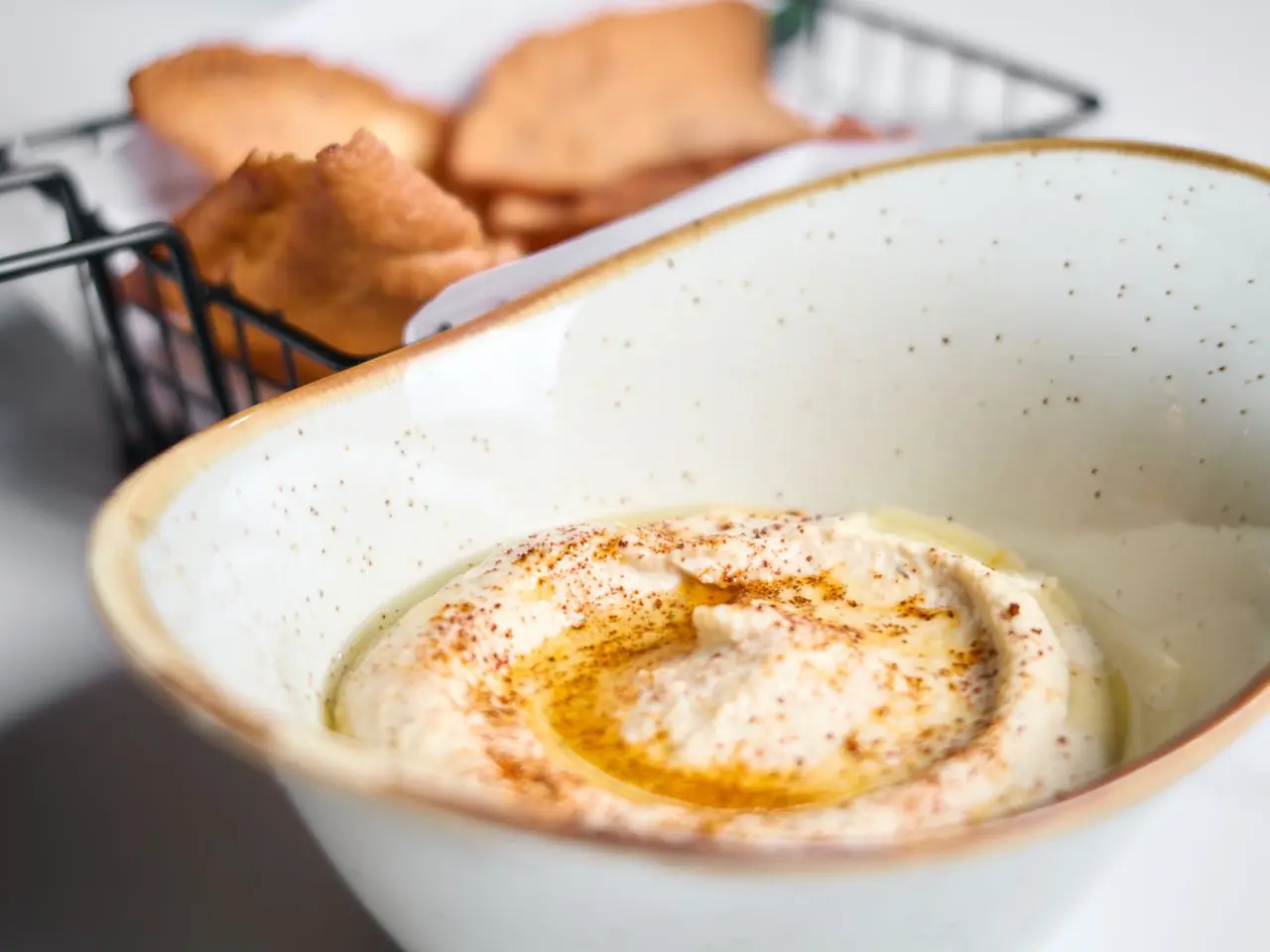Pasta árabe elaborada a base de garbanzos cocidos, servido con pan pita frito.